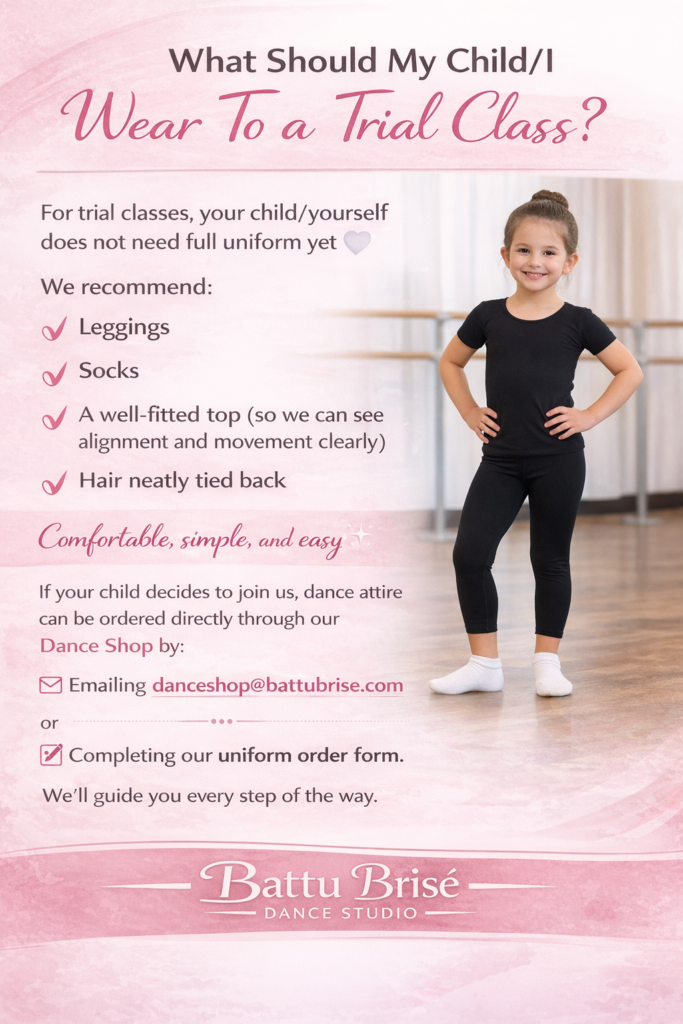 We’re so excited to welcome you to Battu Brisé Dance Studio. Thank you for respecting our policies and helping us create a safe, joyful space for all dancers.